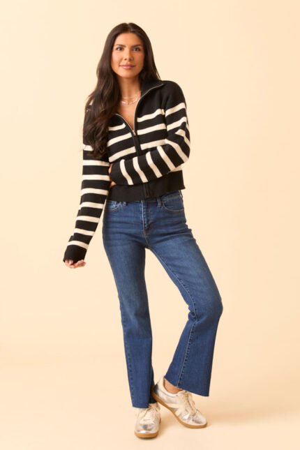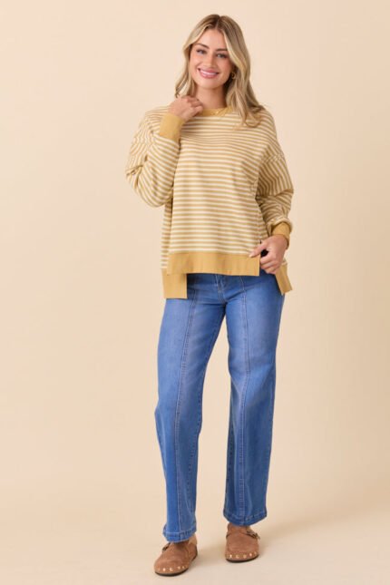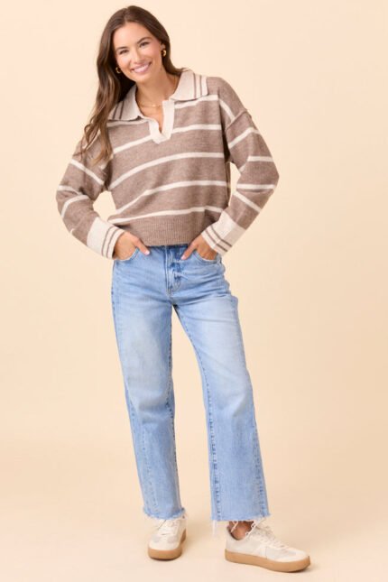 Saylor Taupe Stripe Collared V-Neck Pullover