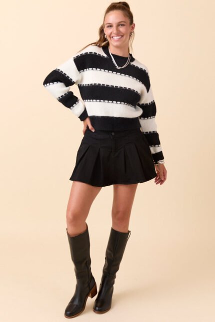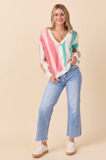 Paris Pink And Brown Varsity Stripe Cable Knit V-neck Pullover