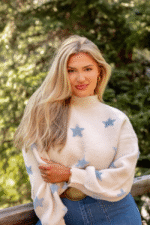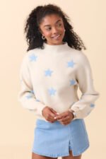 Be the first to review “Tilda Cream and Blue Star Print Mock Neck Sweater” Cancel reply